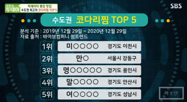 빅데이터 랭킹 맛집 코너에서는 수도권 최고의 코다리찜 TOP5 편이 방송 되었습니다.