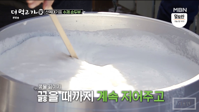 짜낸 콩물은 다시 솥에 부어 끓을때까지 계속 저어 줍니다.