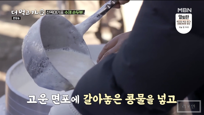 대야를 가득 채운 순도 100% 콩물이 나옵니다.