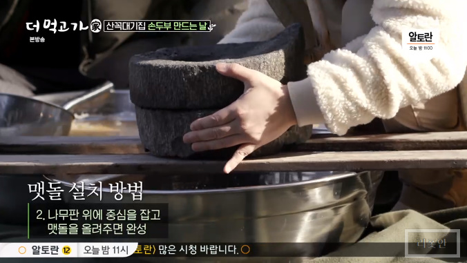 불려놓은 콩을 멧돌에 갈아주기전 맷돌을 설치 합니다.
