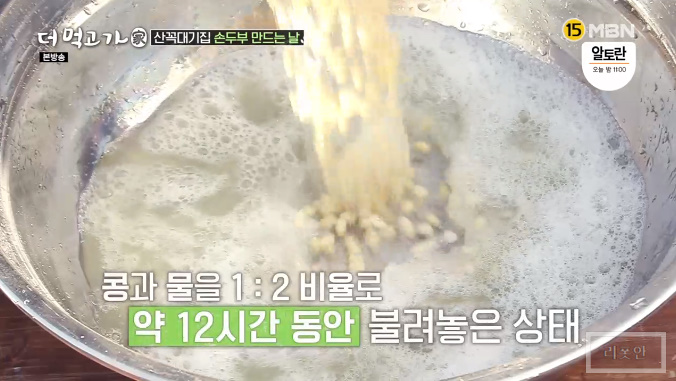 콩과 물을 1:2 비율로 약 12시간 동안 불려 놓습니다.