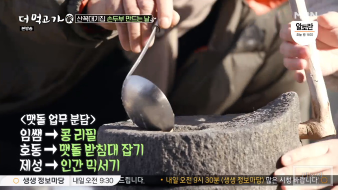 임쌤은 콩을 넣어주고 호동은 맷돌 받침대를 잡고 제성이 맷돌을 돌립니다.