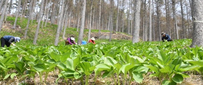 해발 700m 백두대간의 청정지대에서 한창 푸릇푸릇한 명이를 수확 중인 창효 씨.