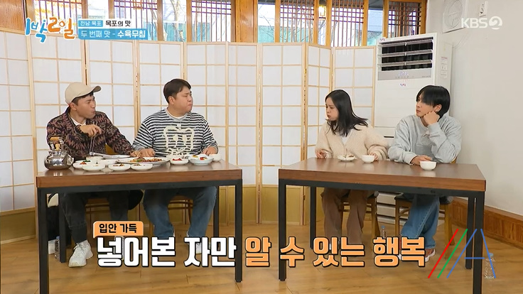 2021년 12월 19일 일요일 저녁 6시 30분 <1박 2일 시즌4> 방송에서는 지난주에 이어 " 목포의 맛 특집 " 편이 방영되며, 다섯멤버와 게스트 혜리가 함께하는 맛의 도시 목포 식도락 여행이 이어집니다. 혜리는 어제부터 몸이 근질근질 했어요라며 텐션을 자랑하며 여행지 방방곡곡을 뛰어다니며 사진을 찍고 두번째 맛으로 수육무침을 먹으러 갔습니다.