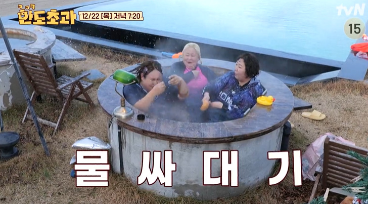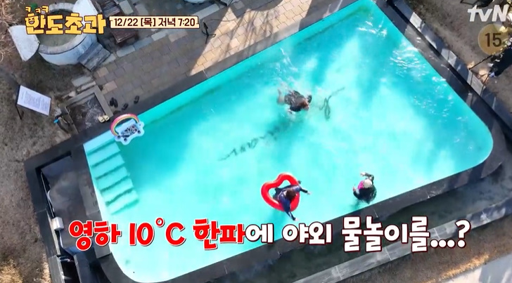 특별한 크리스마스 파티로 한파 속에서 야외 수영장 놀이를 하며