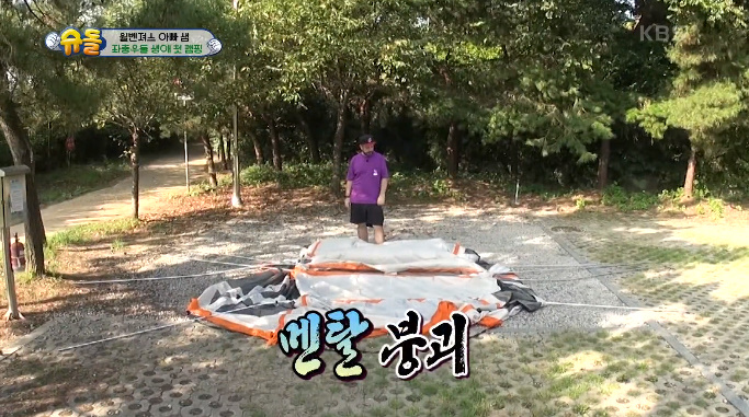 샘해밍턴은 혼자 텐트를 치다가 멘붕에 빠집니다. 너무 커서 혼자는 못치겠다며..