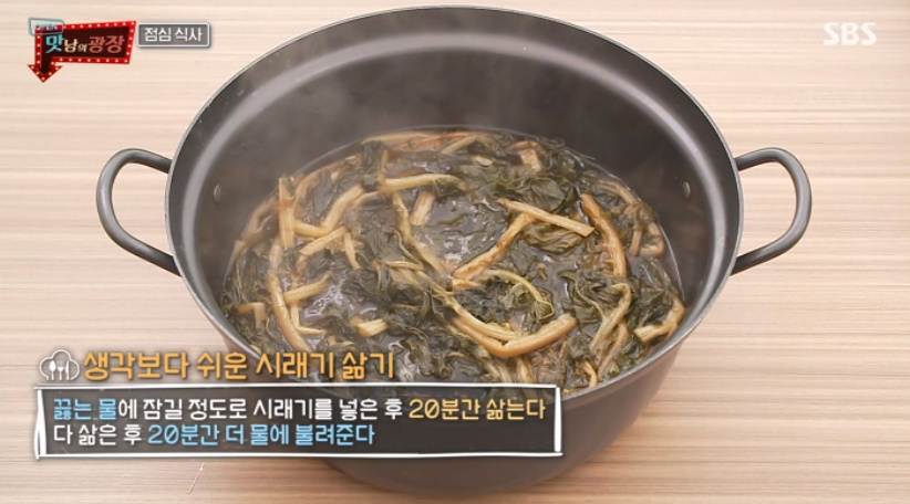 끓는 물에 잠길 정도로 시래기를 넣은후 20분간 삶아준후 20분간 물에 더 불려주면 됩니다.