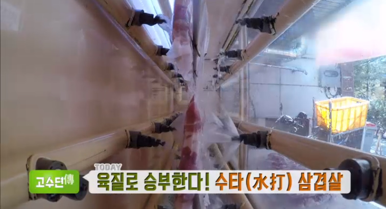 삼겹살을 물로 때려 습식고기숙성으로 보관해 고기 육질이 훨씬부드럽고 맛있다고 합니다.